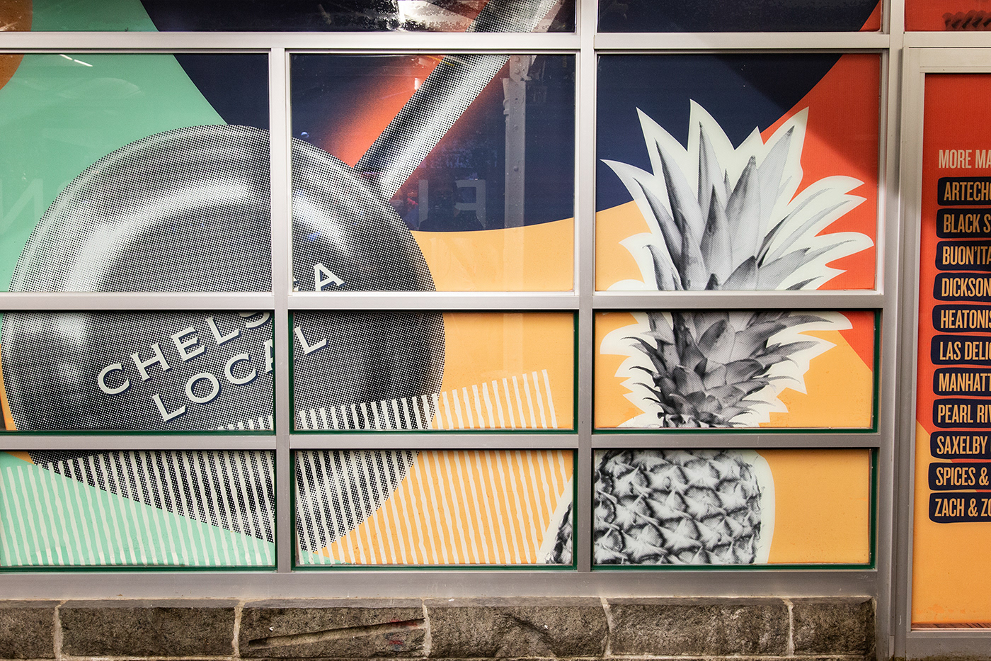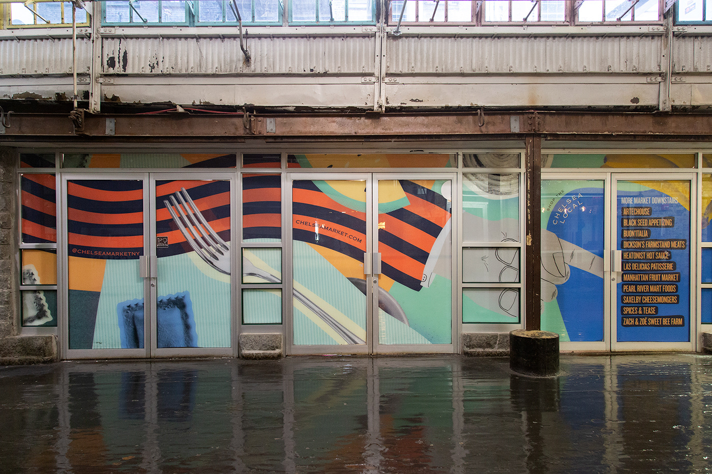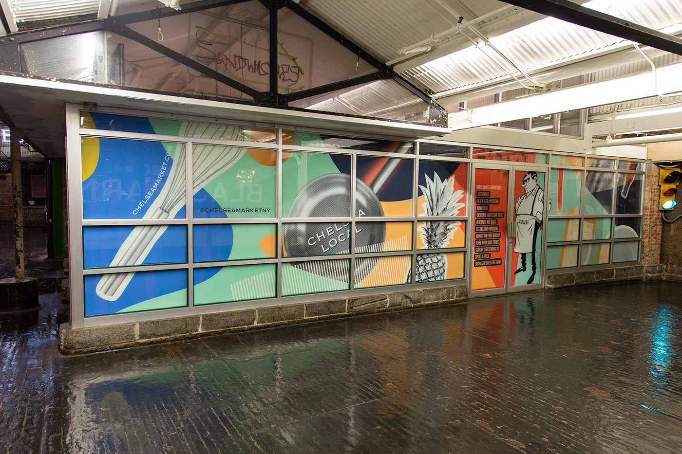 Window wraps celebrating Chelsea Market’s food-centric identity, combined with functional directional elements.
