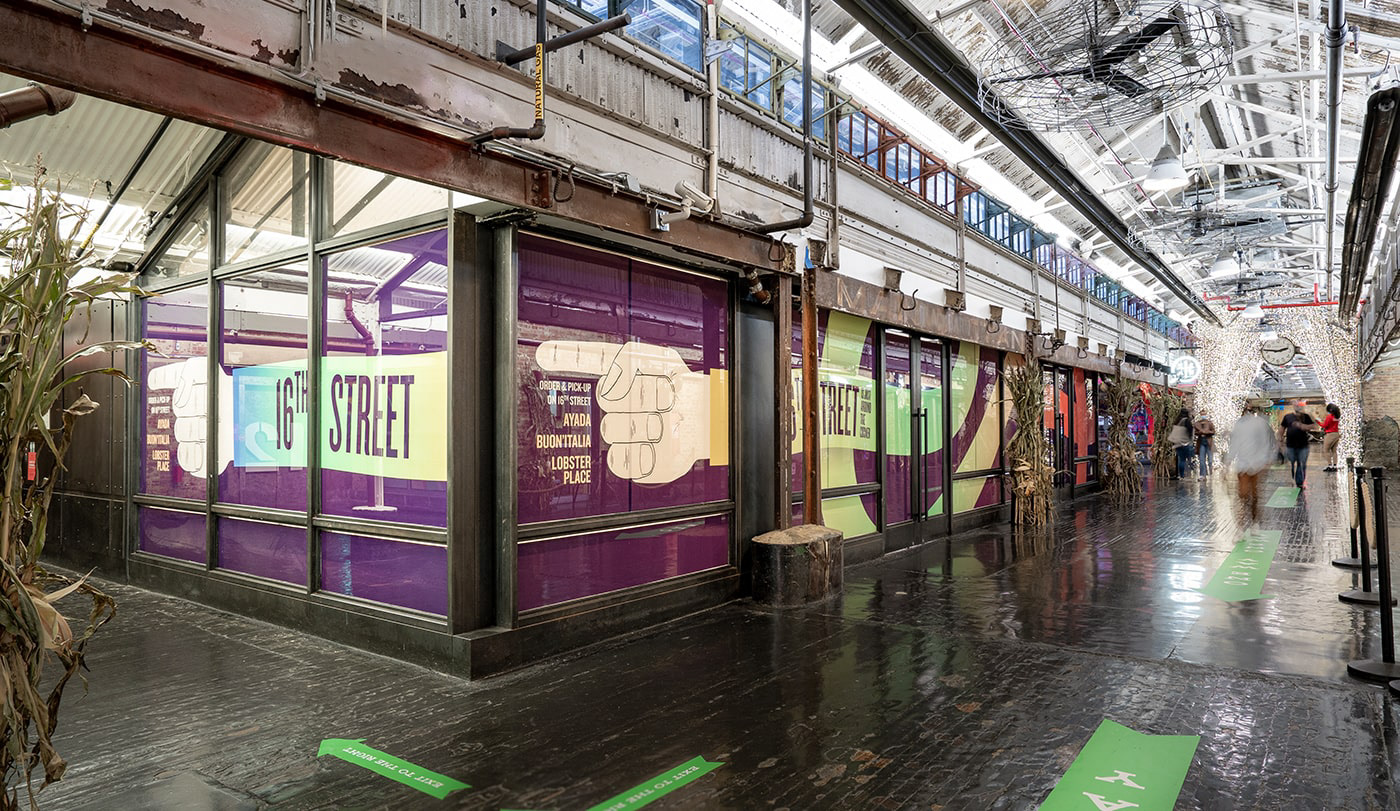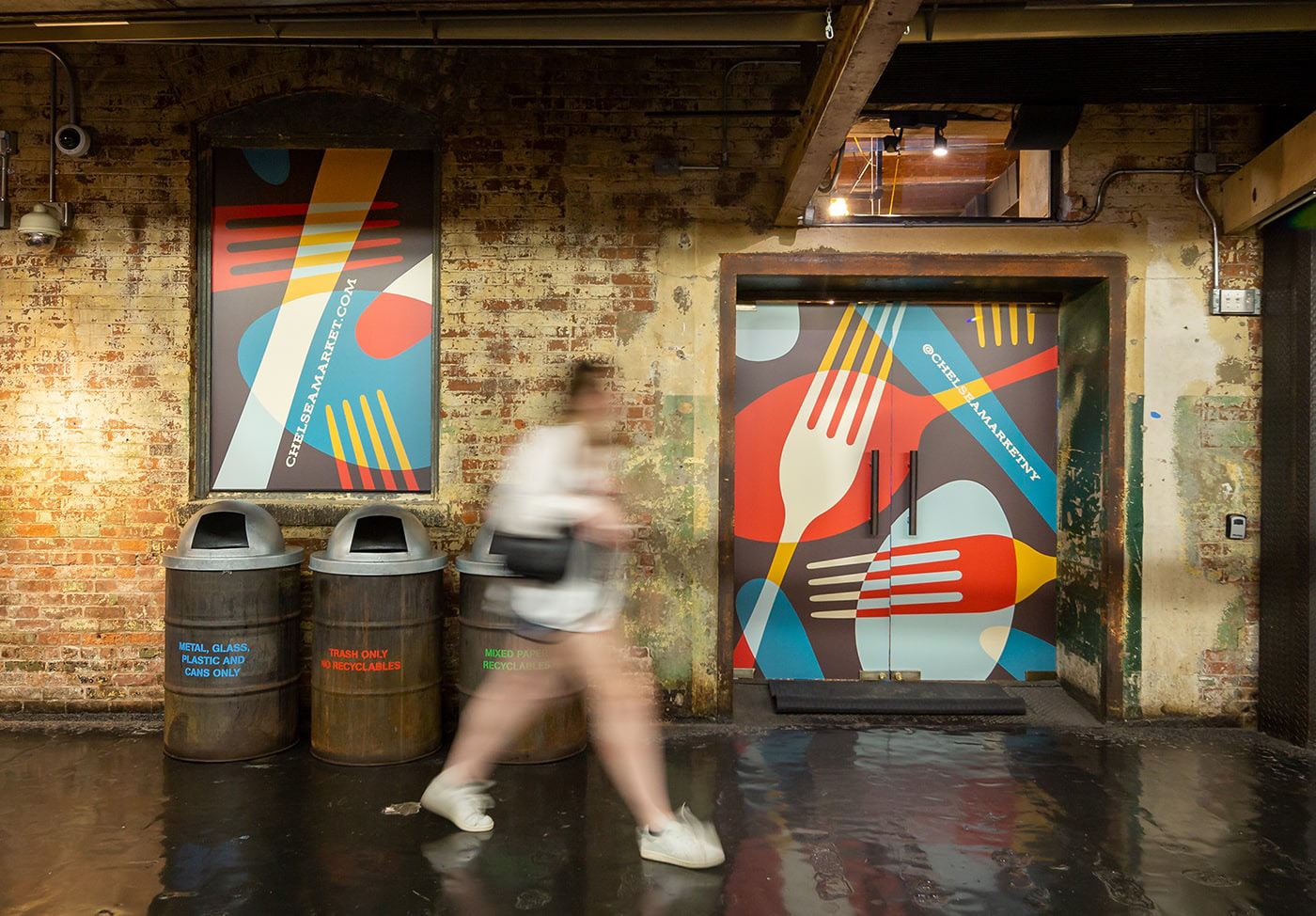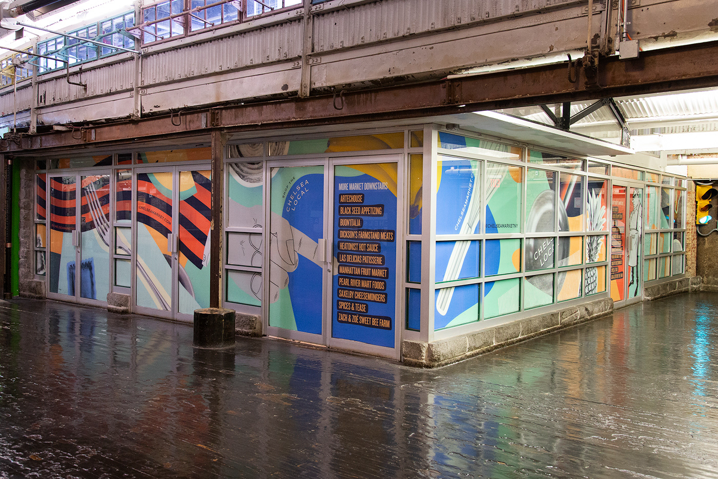Window wraps celebrating Chelsea Market’s food-centric identity, combined with functional directional elements.