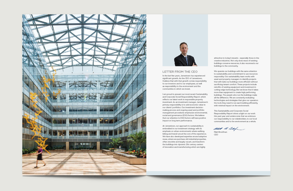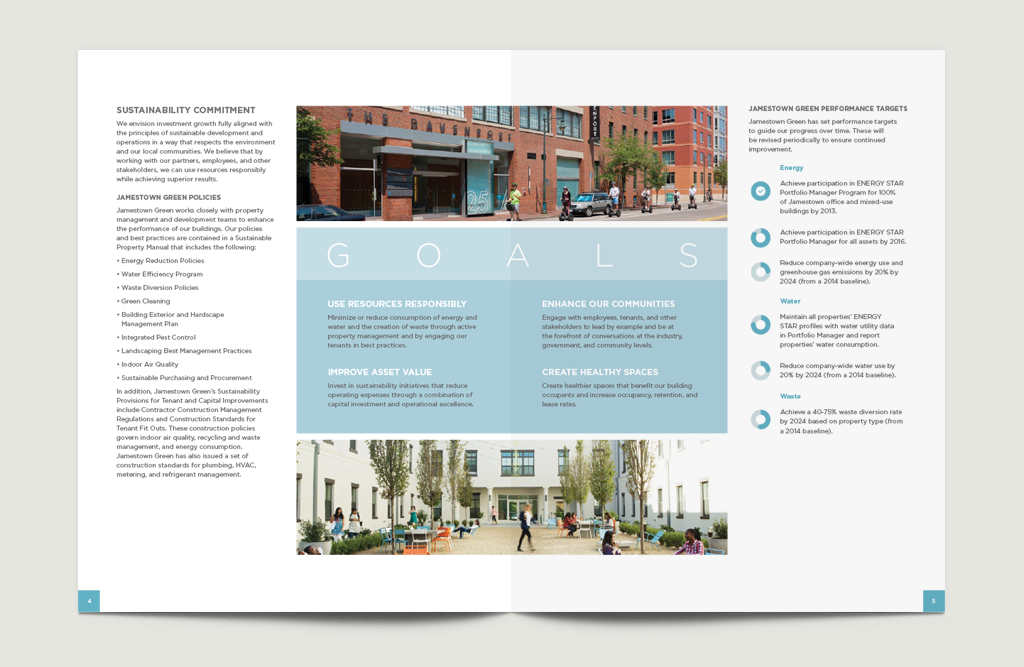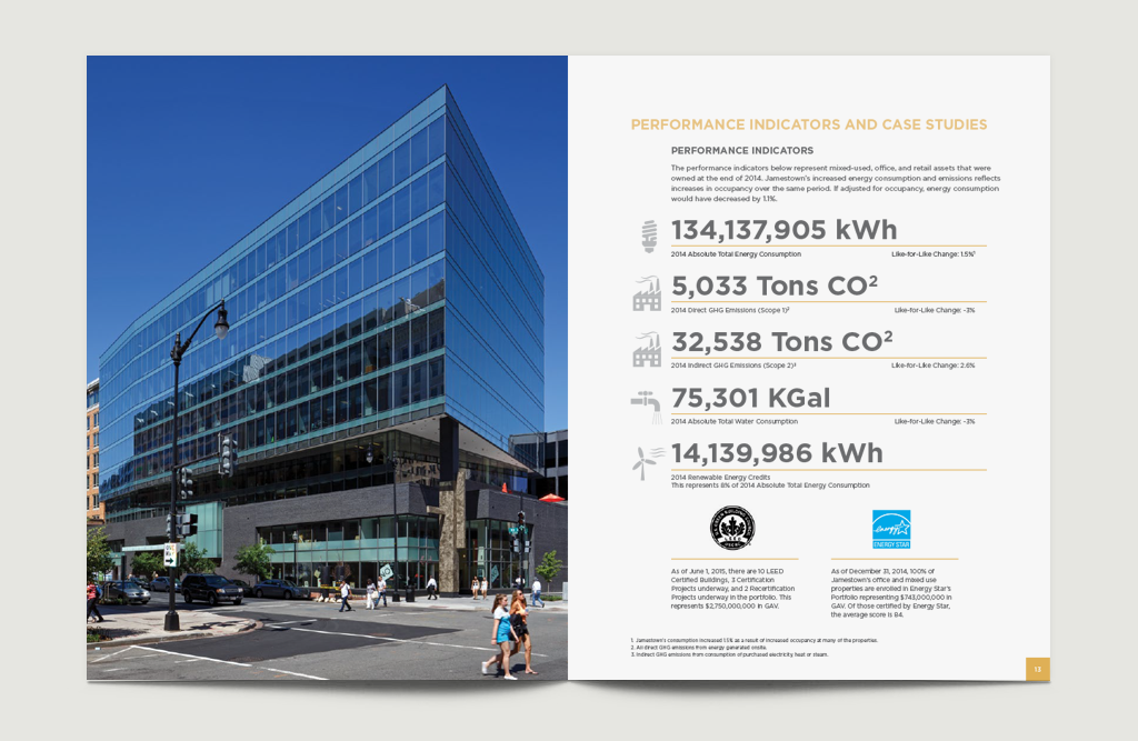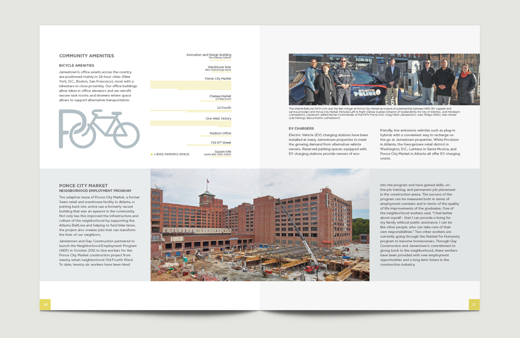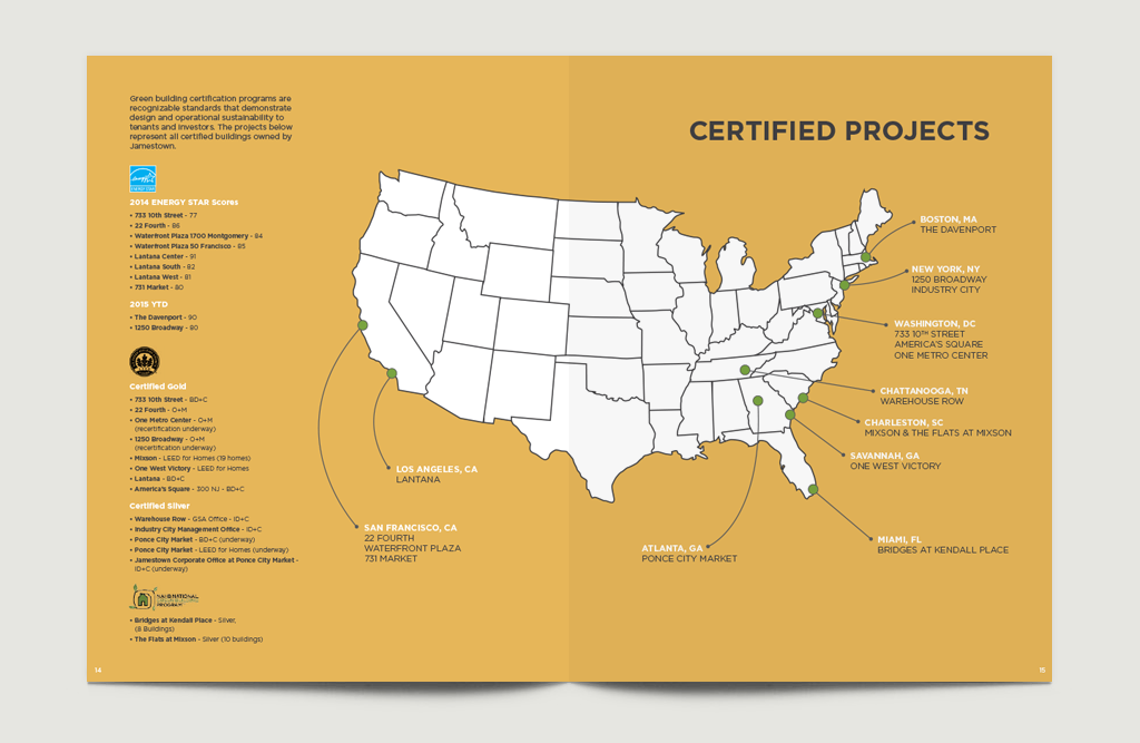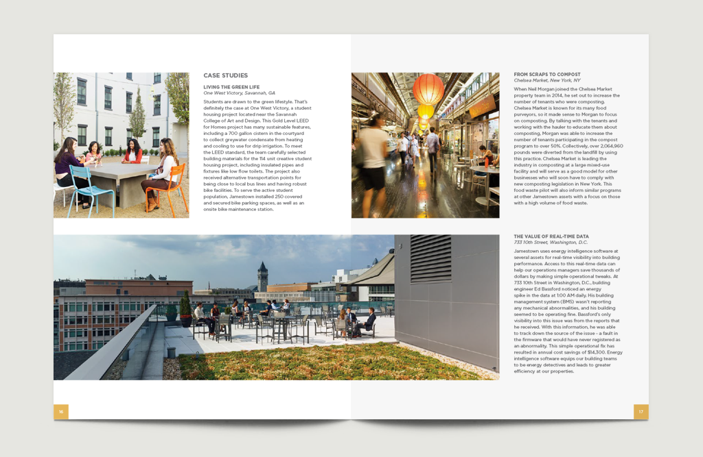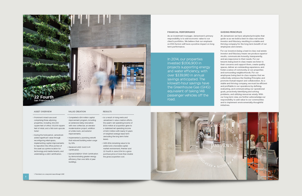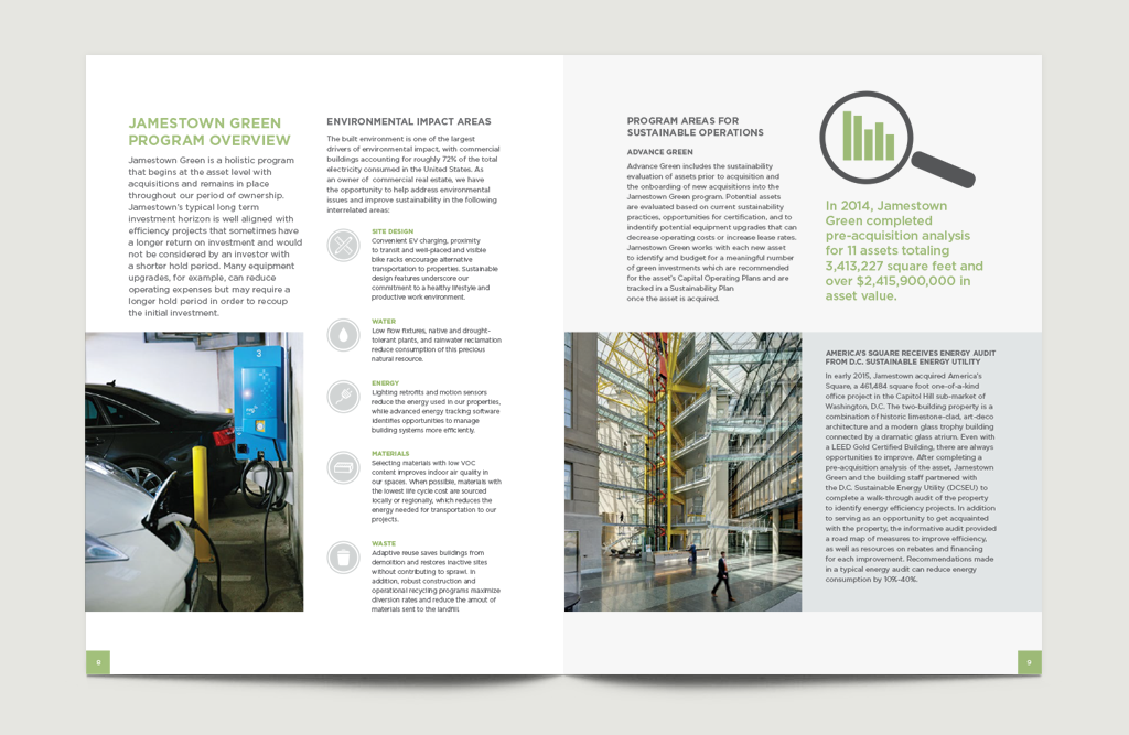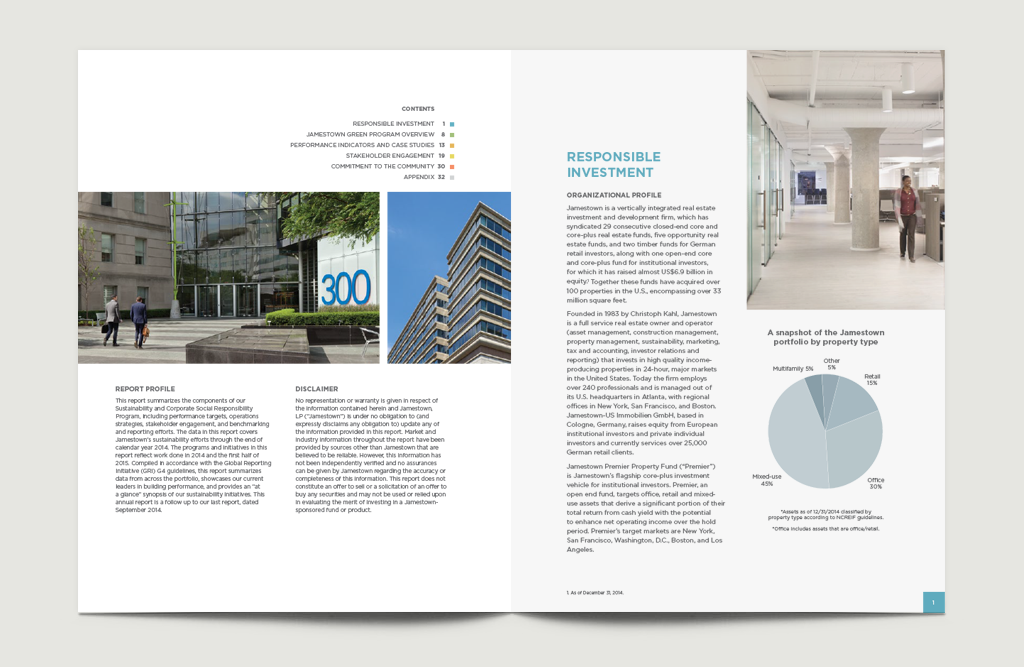 Designed the 2014 Jamestown Green Annual Report, showcasing the company’s sustainability initiatives and social responsibility efforts across property, portfolio, and corporate levels.